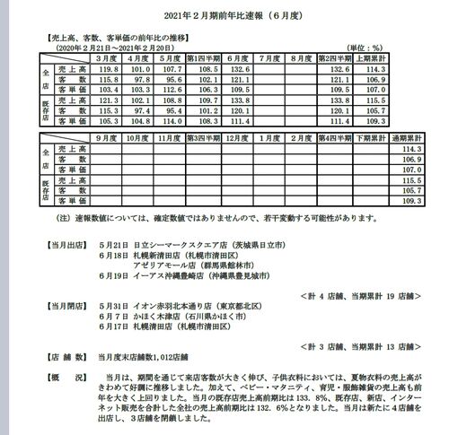 【業績】 西松屋6月度月次発表、売上高は前年対比132% 客単価の好調が続いてたところに客数が戻り大幅増収。夏物衣類が好調とのこと。PTSは6.2%上昇。【感想】 緊急事態宣言解除後とは言え予想外の強い数字、機関は他のアパレルホールドしてるなら西松屋買い…